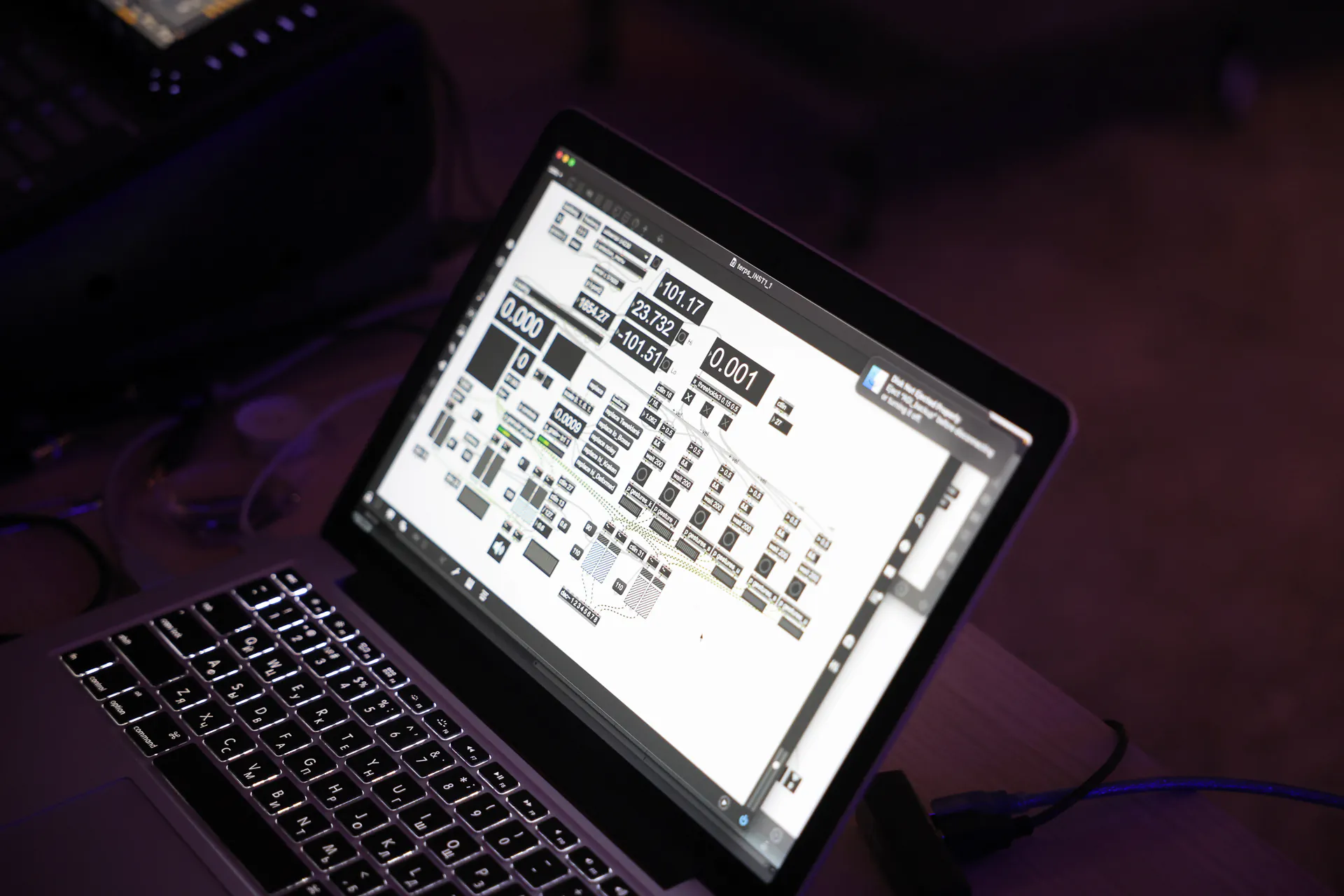 «Τελικά, γίνεται μια χορογραφία με την κίνηση και τη συγκεκριμένη θέση του σώματος που τροφοδοτεί το σύστημα για να φτιάξει ήχο», λέει ο Σμιρνόφ καθισμένος πίσω από την κονσόλα του.