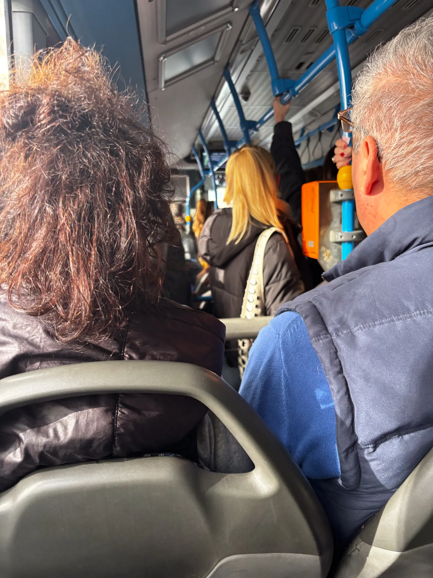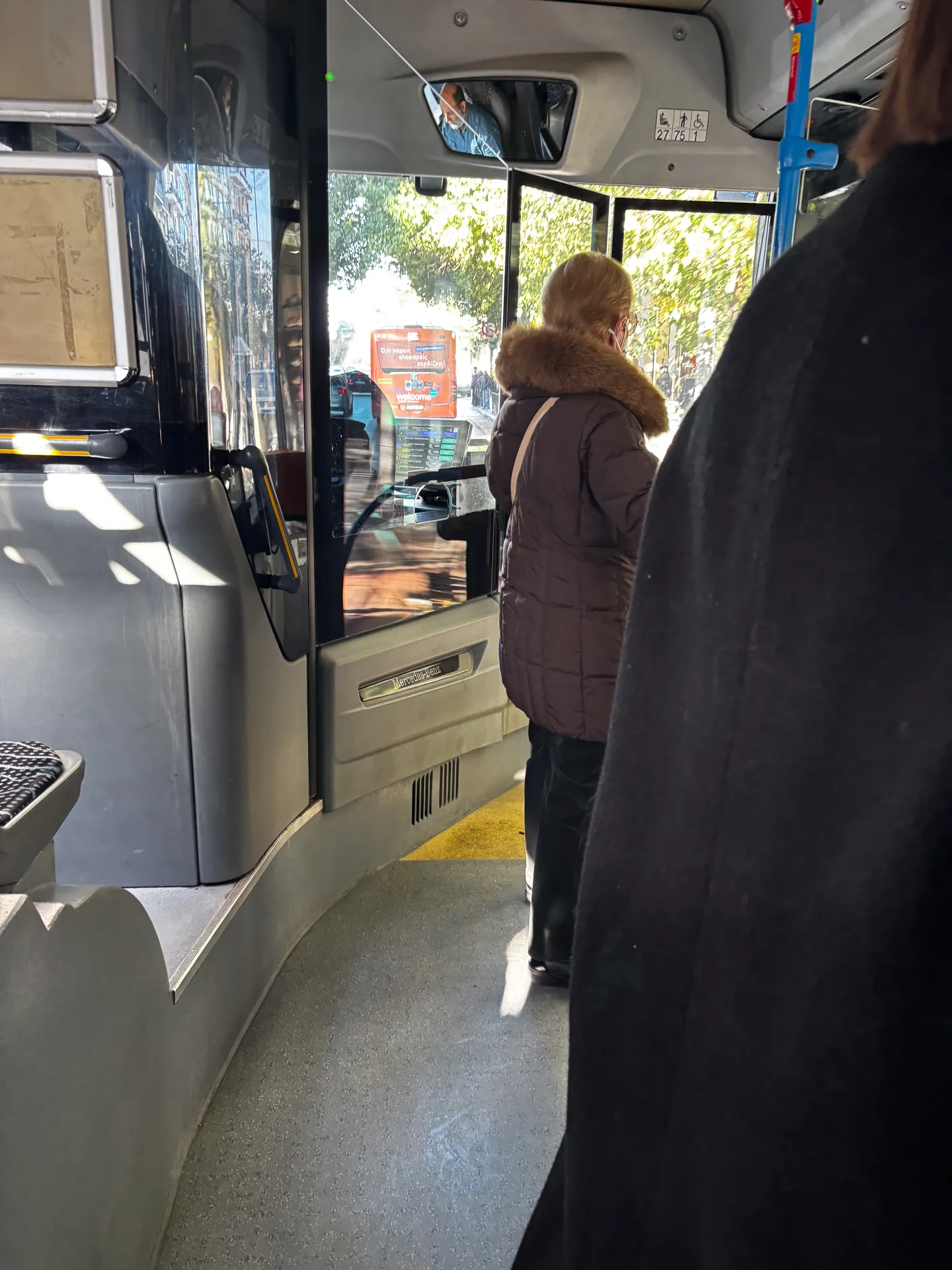 Στο λεωφορείο επικρατεί ησυχία. Νέοι άνθρωποι με ακουστικά πηγαίνουν στη δουλειά ή στο πανεπιστήμιο. Κοντά στην μπροστινή πόρτα, ηλικιωμένοι πιάνουν κουβέντα.