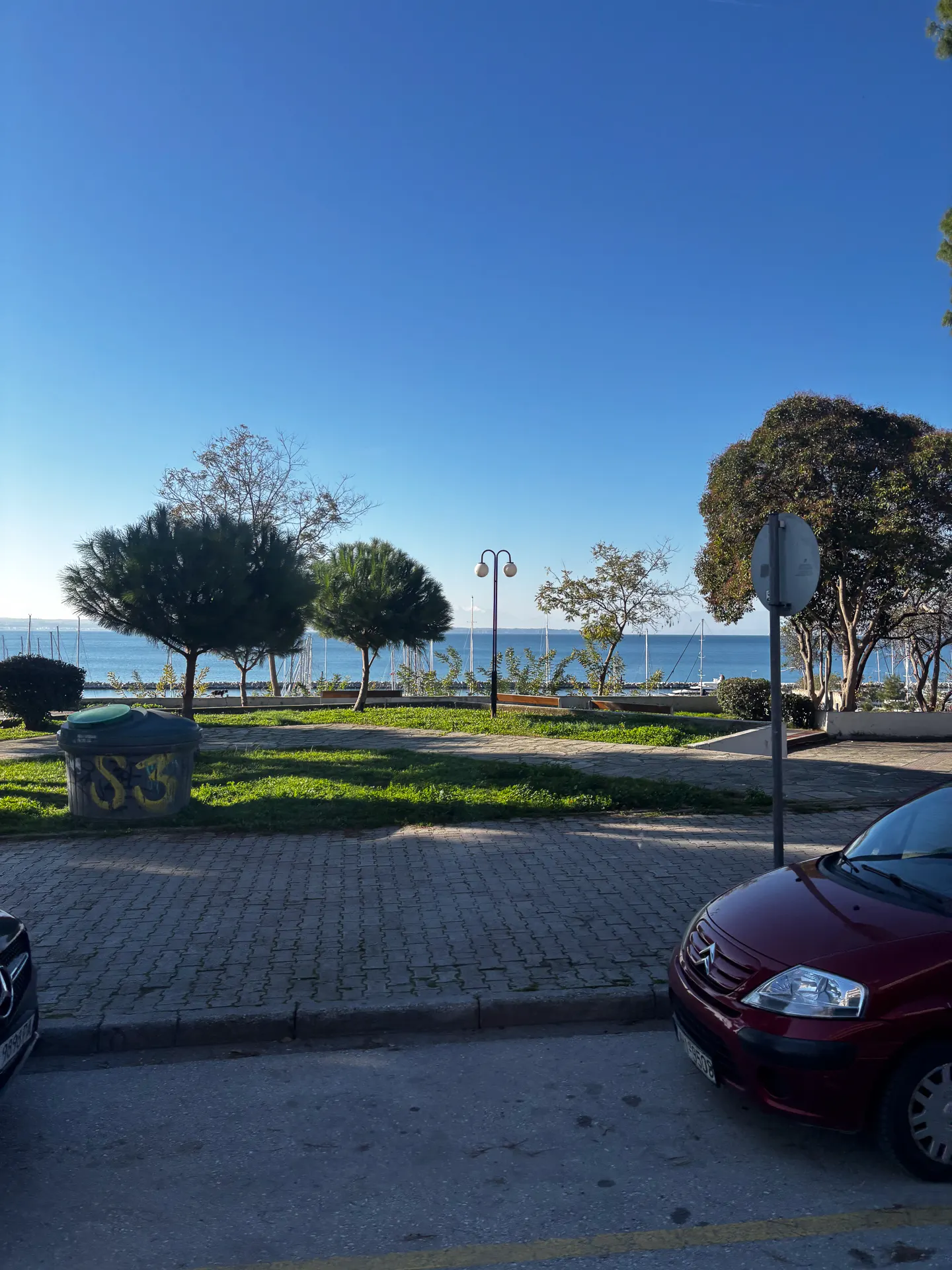 Μόλις βγαίνουμε στη Νικολάου Πλαστήρα, ο χιονισμένος Όλυμπος εμφανίζεται στα αριστερά μου. Τα πλεονεκτήματα της θέσης. Αγναντεύω τη θάλασσα. Στον ορίζοντα, πλοία με κοντέινερ. Στη Μαρίνα της Αρετσούς, γυναίκες και άντρες κάθε ηλικίας τρέχουν, περπατούν, βγάζουν βόλτα τα σκυλάκια τους. Η πόλη ξυπνά.