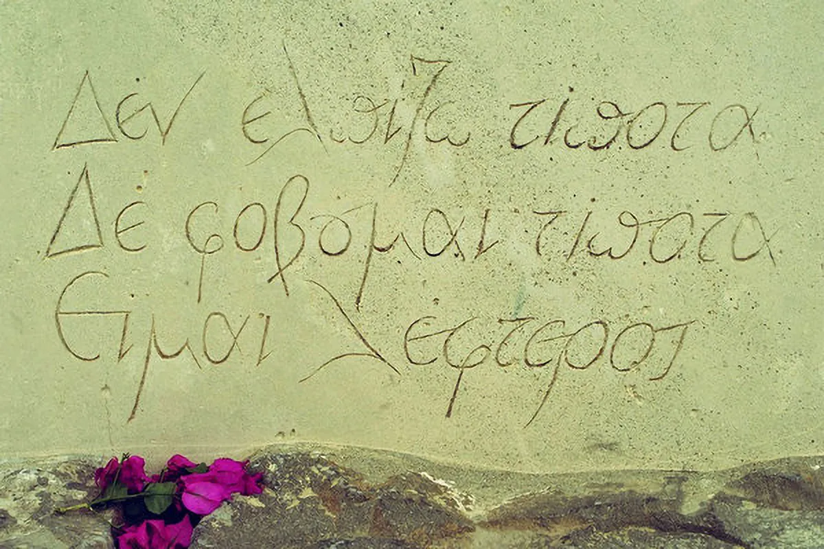 Ο Νίκος Καζαντζάκης, ωστόσο, υψιπετής των ιδεών και των μεγάλων ερωτημάτων, ζήτησε να ταφεί στο ψηλότερο σημείο του Ηρακλείου Κρήτης, στον Προμαχώνα Μαρτινέγκο των ενετικών τειχών, και να χαραχτεί στην πλάκα του τάφου του: «Δεν ελπίζω τίποτα, δεν φοβούμαι τίποτα, είμαι λέφτερος», δίνοντας έτσι ένα δραματικό τέλος στην εναγώνια πνευματική αναζήτησή του.