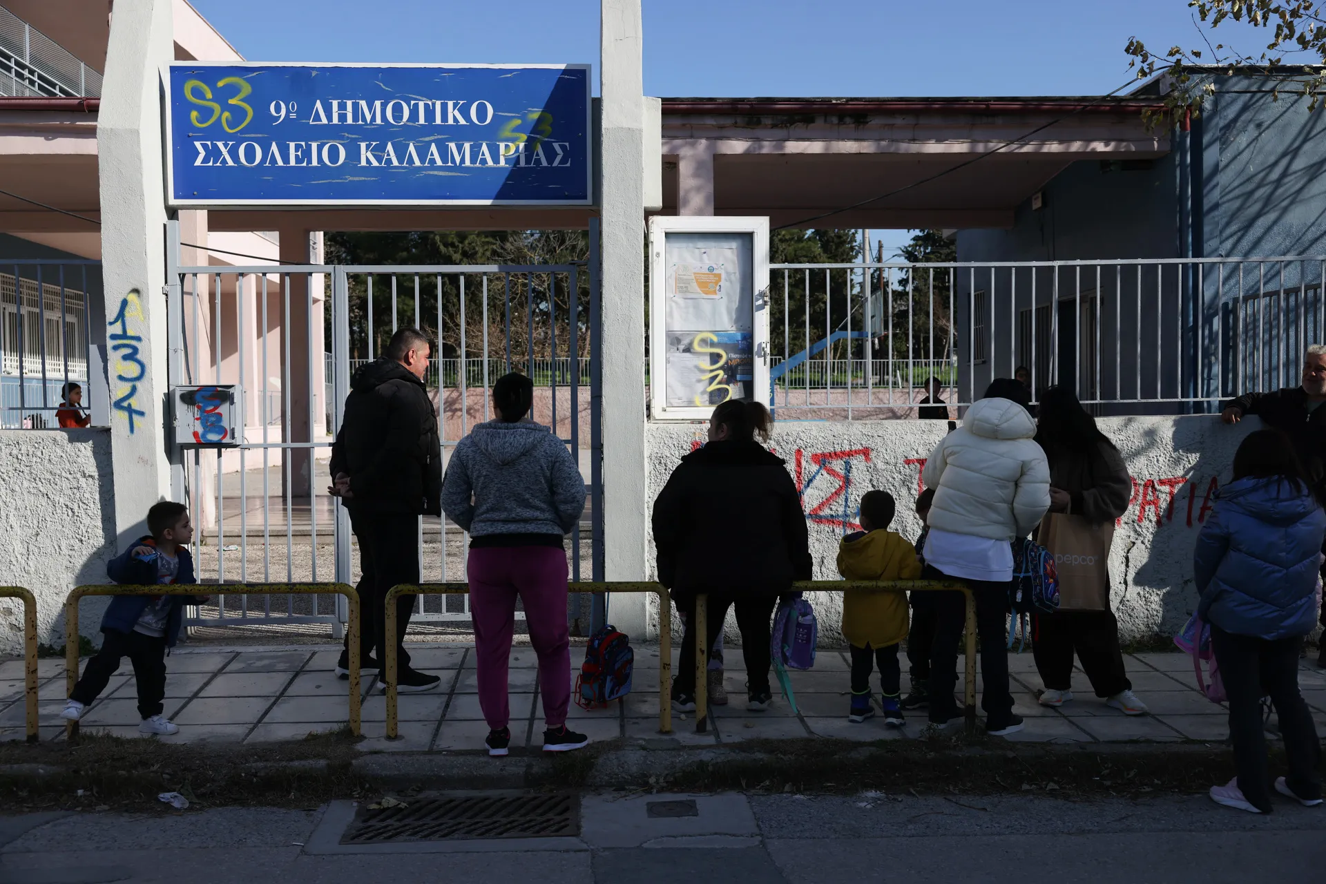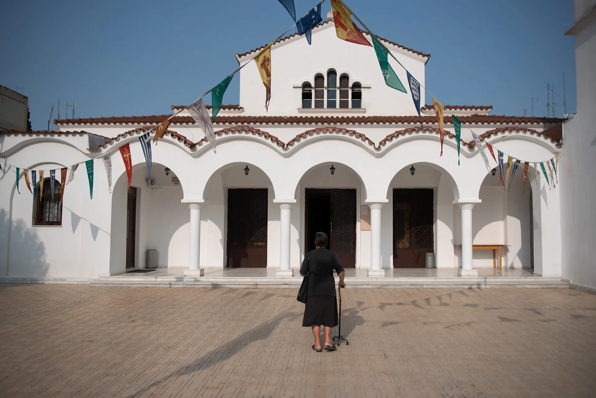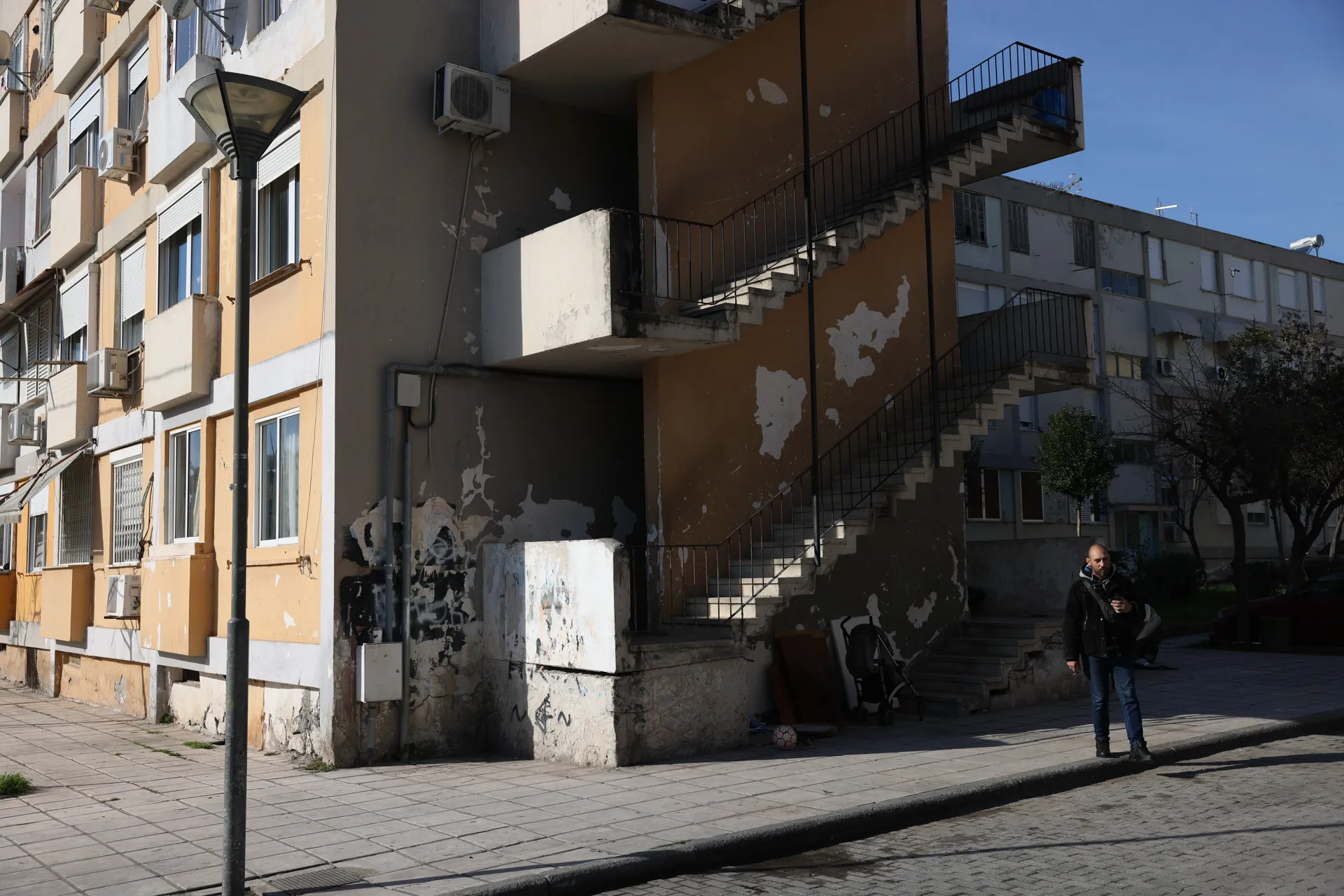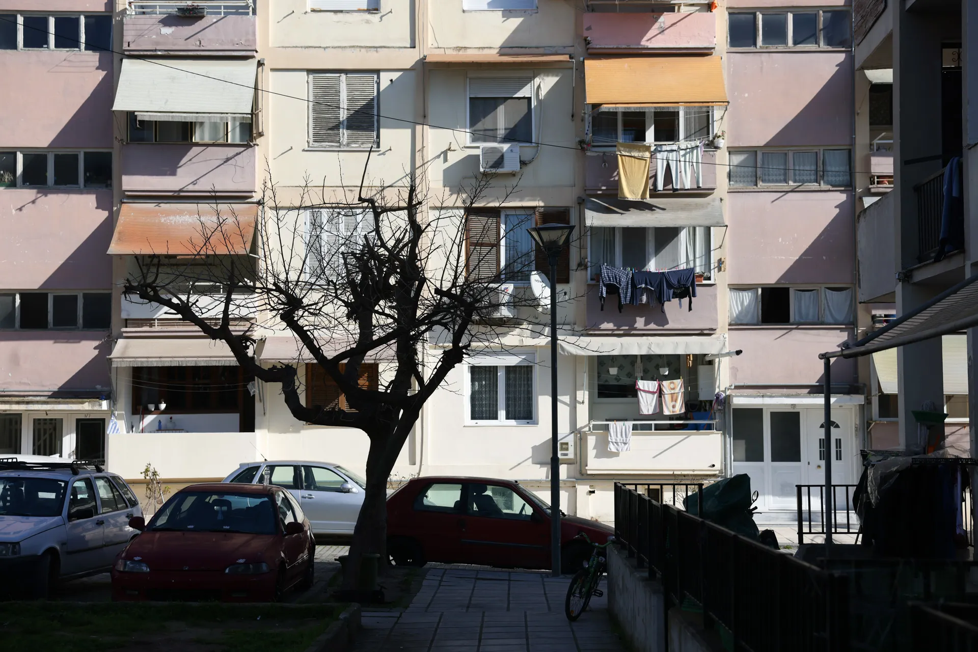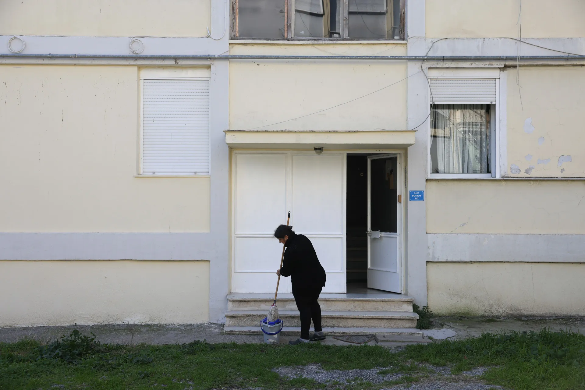 Λίγα μέτρα πιο κάτω κυρία Χριστίνα καθαρίζει την είσοδο της οικοδομής της.