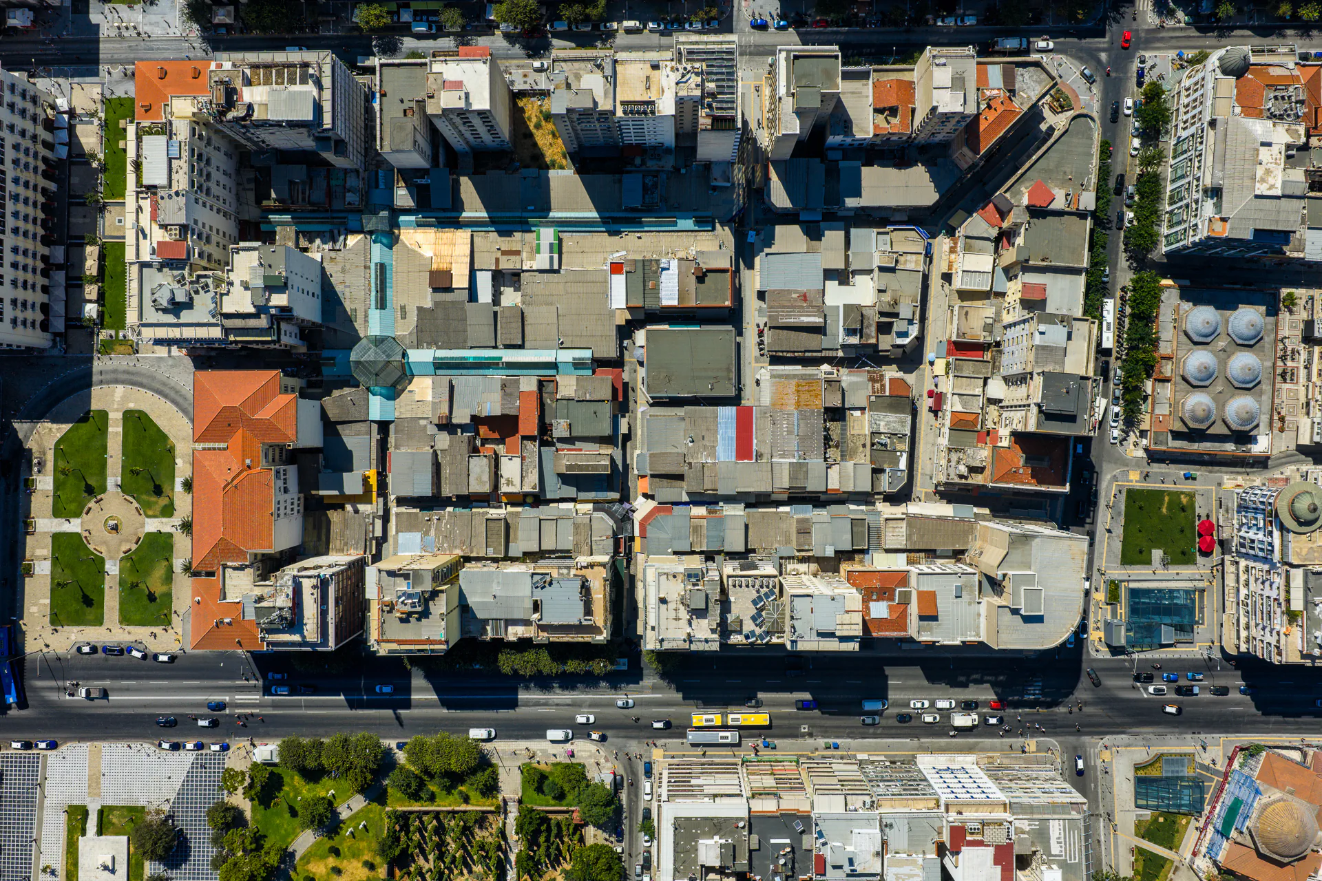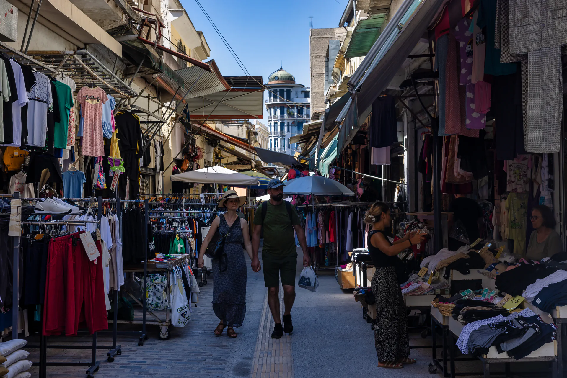 Πιο πέρα, έμποροι απλώνουν σε ράφια και κρεμούν παπούτσια, ρούχα, τσάντες. Στην άλλη μεριά της αγοράς τα κεπέγκια είναι ακόμα κατεβασμένα. Χαζεύω τα γκράφιτι και τις πορτοκαλί αχτίδες της ανατολής του ήλιου που ζωγραφίζουν τα παλιά κτίρια.