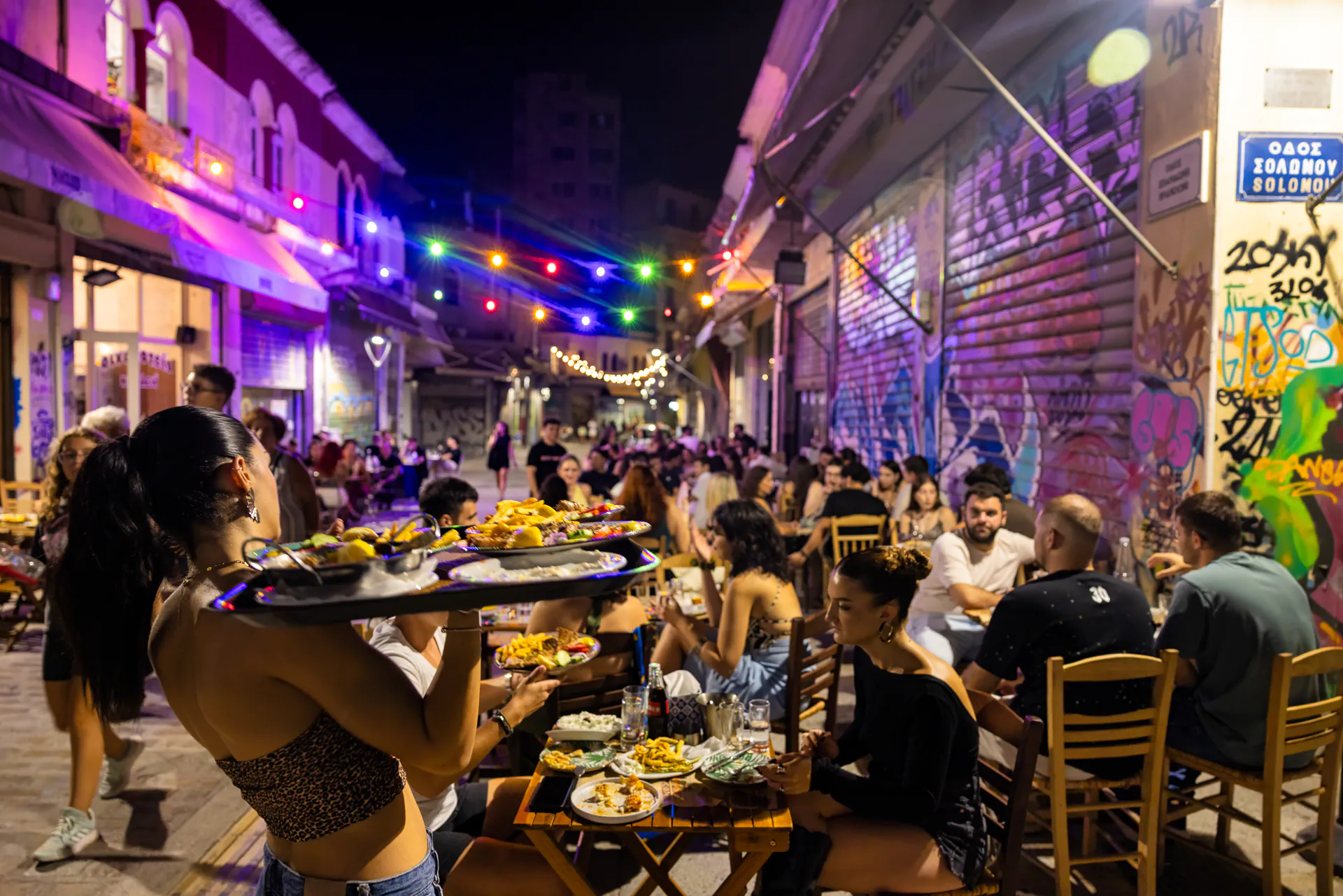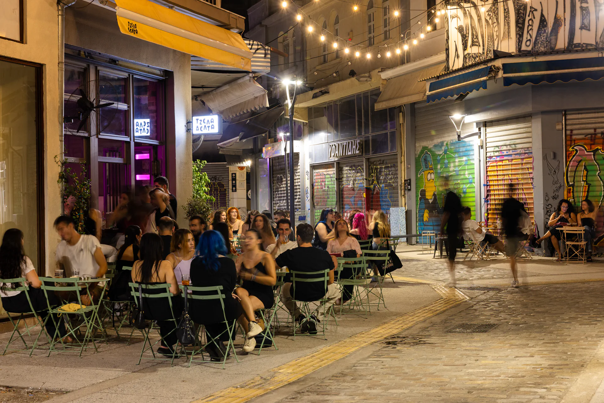 Σε κάποια σημεία, μπροστά στα κλειστά ρολά των πρωινών επιχειρήσεων απλώνονται γεμάτα τα τραπεζάκια των μεζεδοπωλείων. Παρέες πίνουν κρασί στο παραδοσιακό καφενείο «στου Μήτσου», νέοι διασκεδάζουν στη «Τζέλα Δέλτα», ενώ στα dj πάρτυ γεμίζει όλο το πλακόστρωτο της Σπανδώνη.