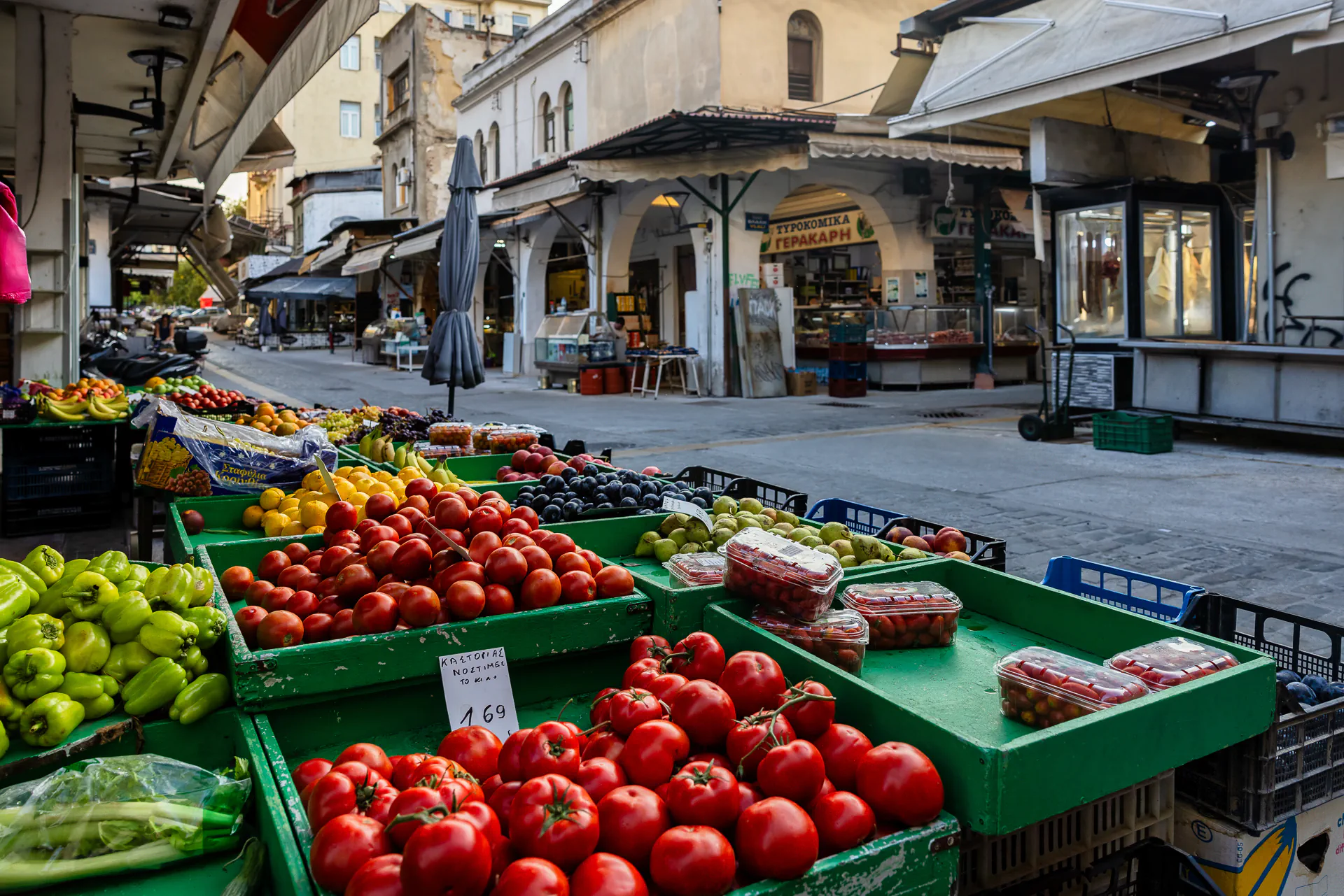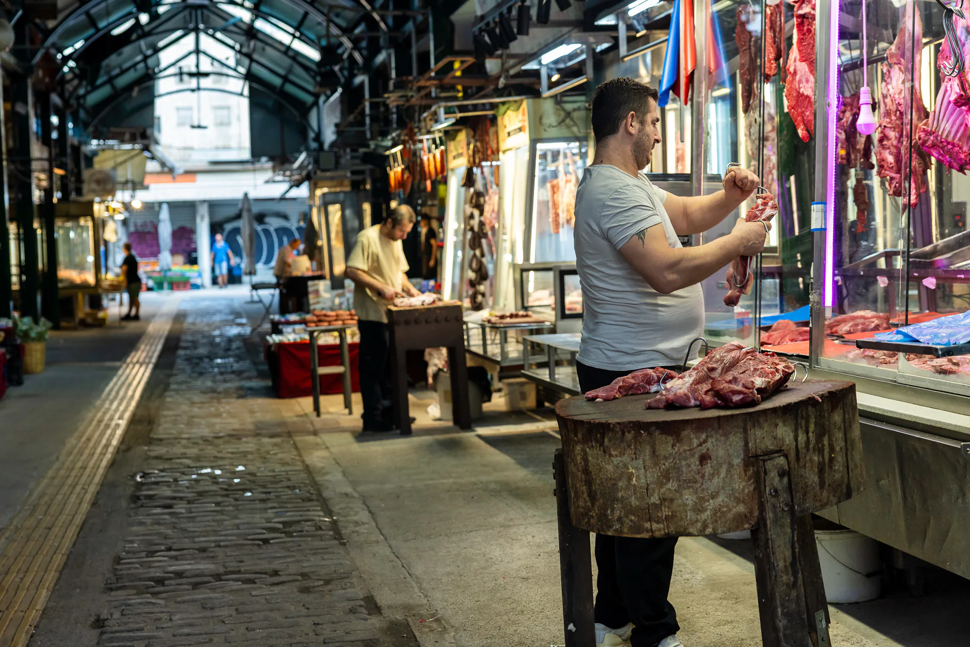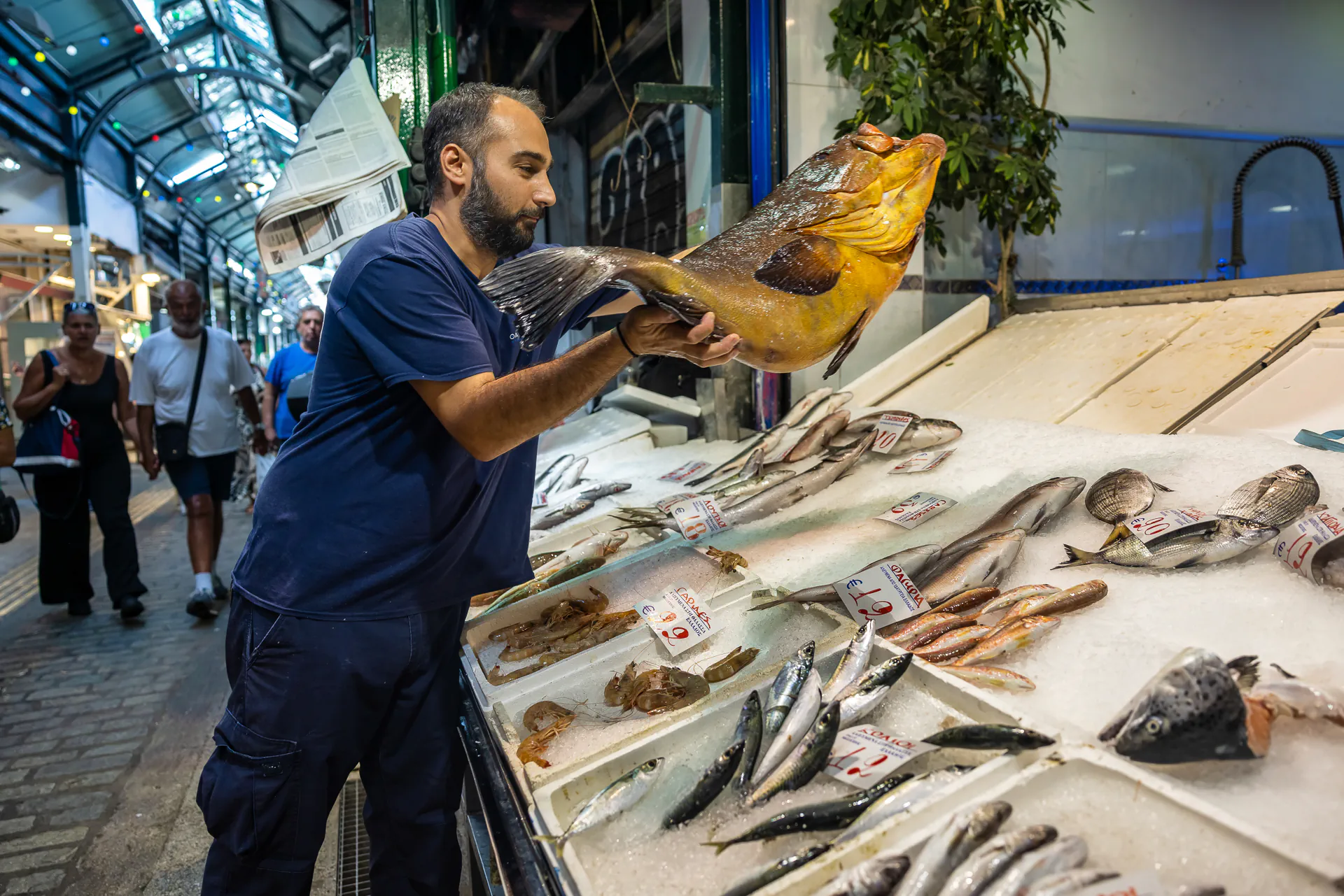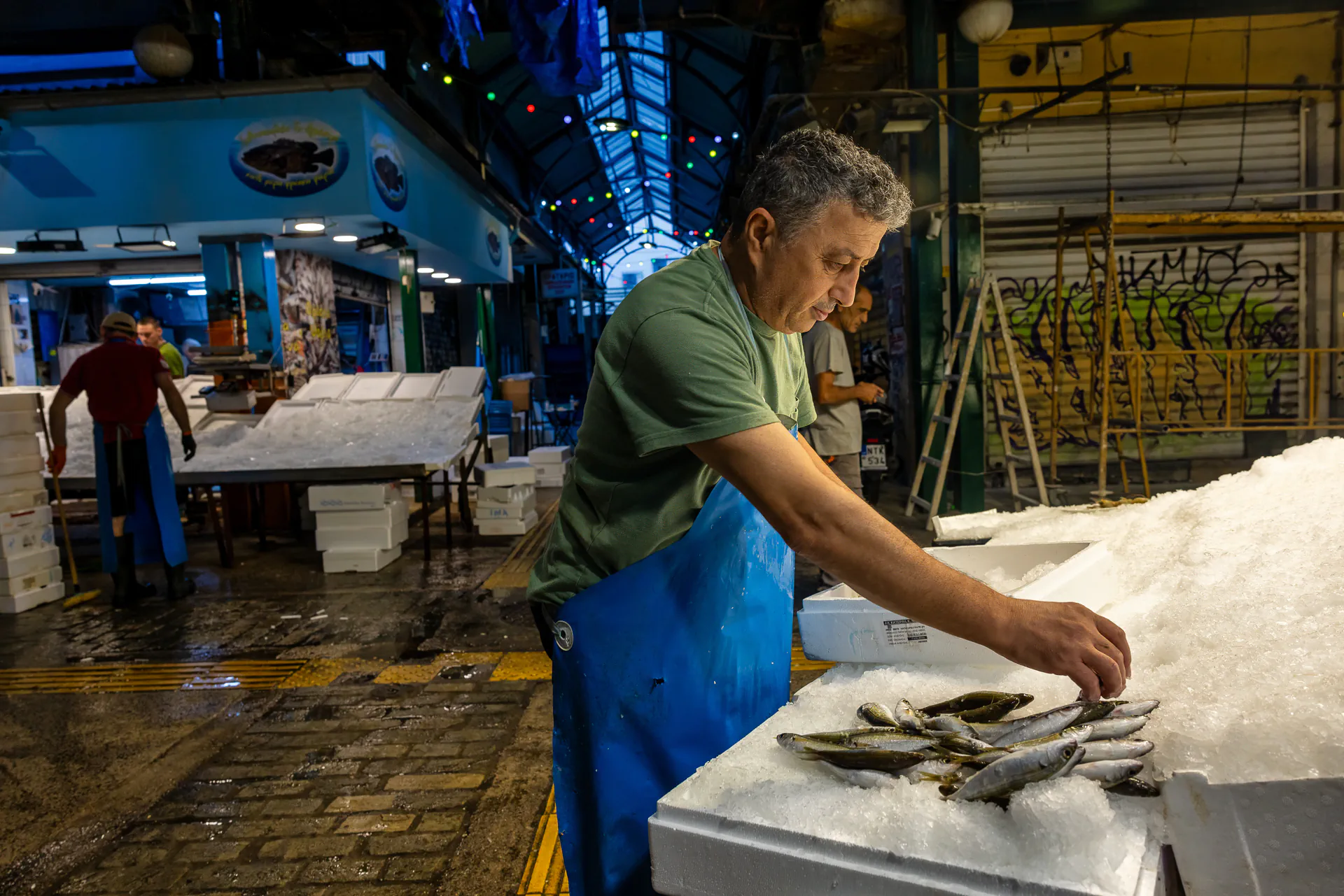 Οι ψαράδες γεμίζουν πάγο τους πάγκους τους και απλώνουν τα φρέσκα ψάρια σε συμμετρικές σειρές. Στα κρεοπωλεία, οι μπαλτάδες πέφτουν ρυθμικά, τα κρέατα τεμαχίζονται και μπαίνουν στα τσιγκέλια. Οι μανάβηδες μεταφέρουν με καρότσια τα καφάσια τους, γεμίζοντας τα στενά με μια πανδαισία χρωμάτων.