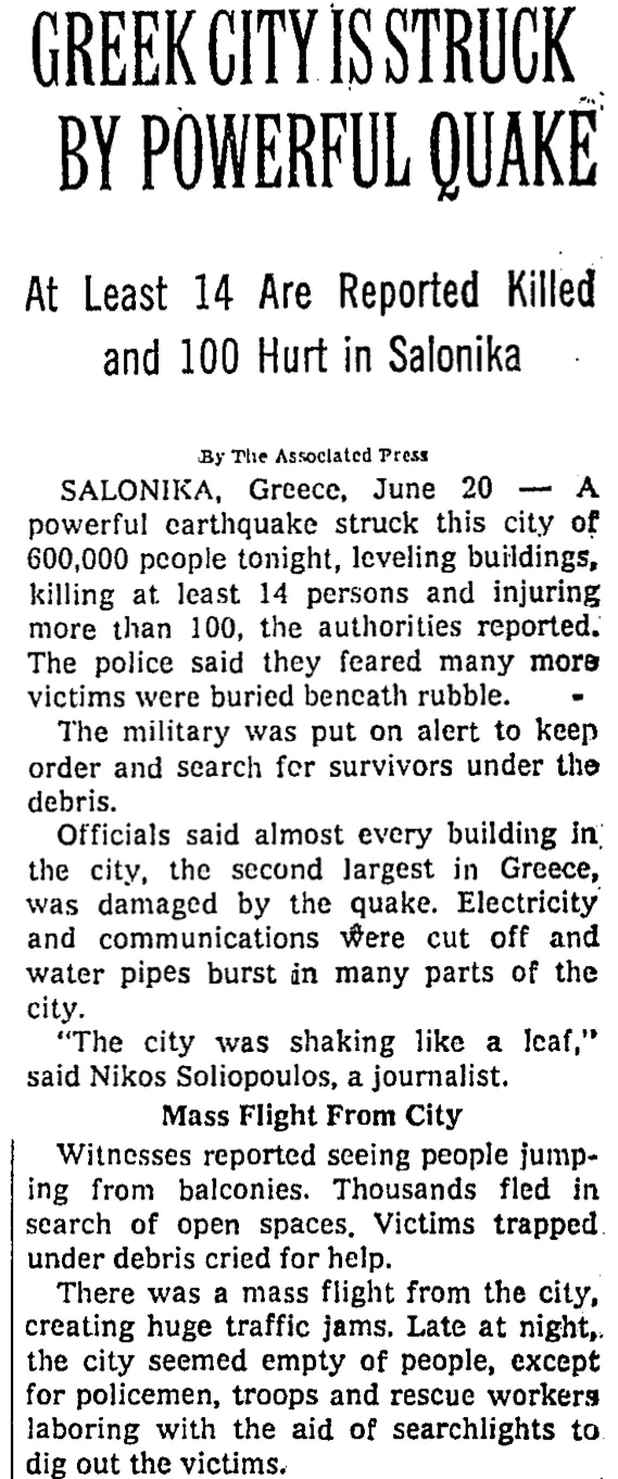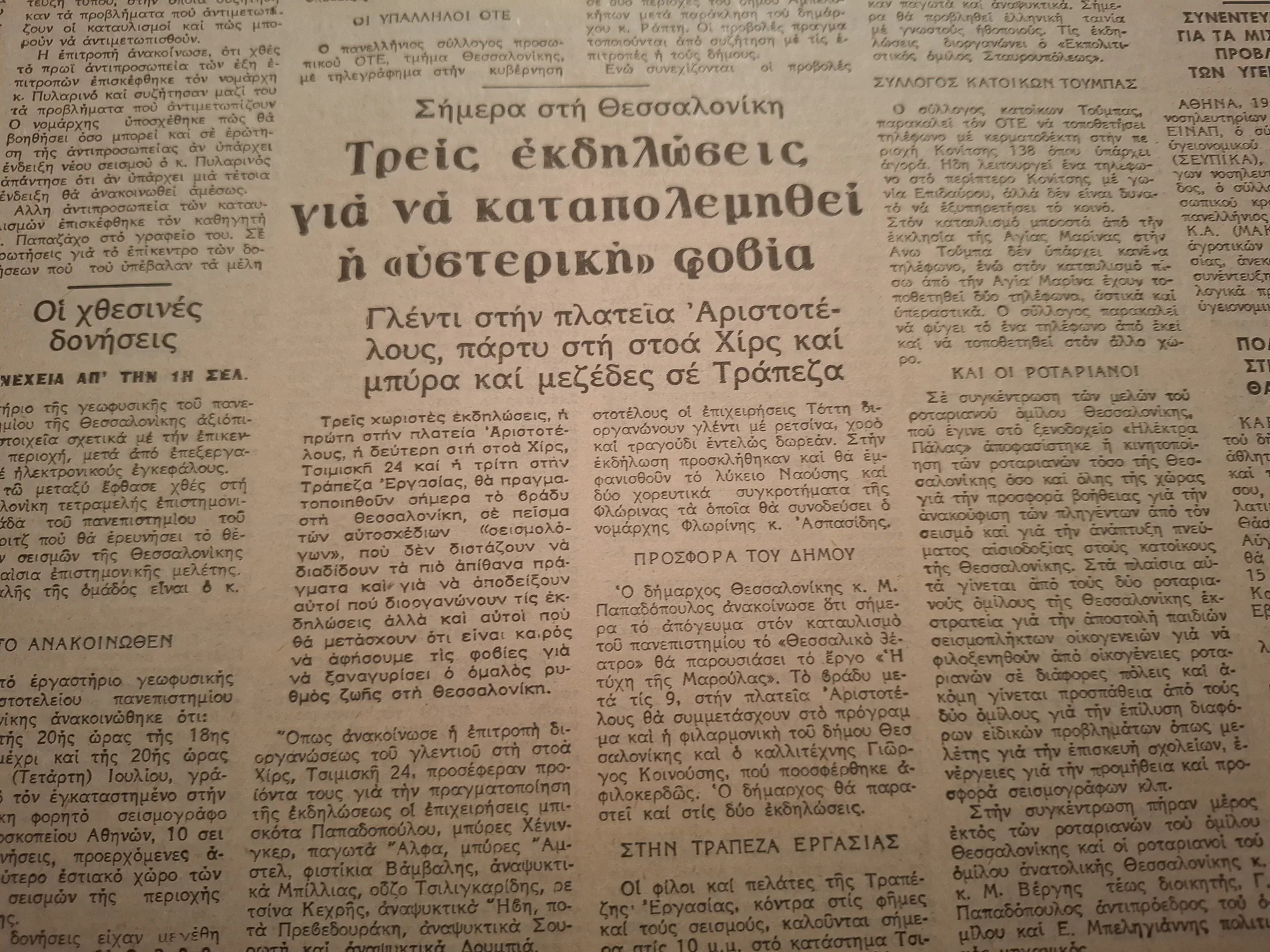 «Τρεις εκδηλώσεις για να καταπολεμηθεί η “υστερική” φοβία» προαναγγέλλει στο φύλλο της 20ής Ιουλίου 1978 και η εφημερίδα «Μακεδονία». Το δημοσίευμα κάνει λόγο για «γλέντι στην πλατεία Αριστοτέλους, πάρτι στη στοά Χιρς και μπύρα και μεζέδες σε Τράπεζα», περιγράφοντας τις τρεις εκδηλώσεις που έχουν προγραμματιστεί το βράδυ της πανσελήνου στο κέντρο της Θεσσαλονίκης «σε πείσμα των αυτοσχέδιων σεισμολόγων που δεν διστάζουν να διαδίδουν τα πιο απίθανα πράγματα και για να αποδείξουν αυτοί που διοργανώνουν τις εκδηλώσεις αλλά και αυτοί που θα μετάσχουν ότι είναι καιρός να αφήσουμε τις φοβίες για να ξαναγυρίσει ο ομαλός ρυθμός ζωής στη Θεσσαλονίκη».