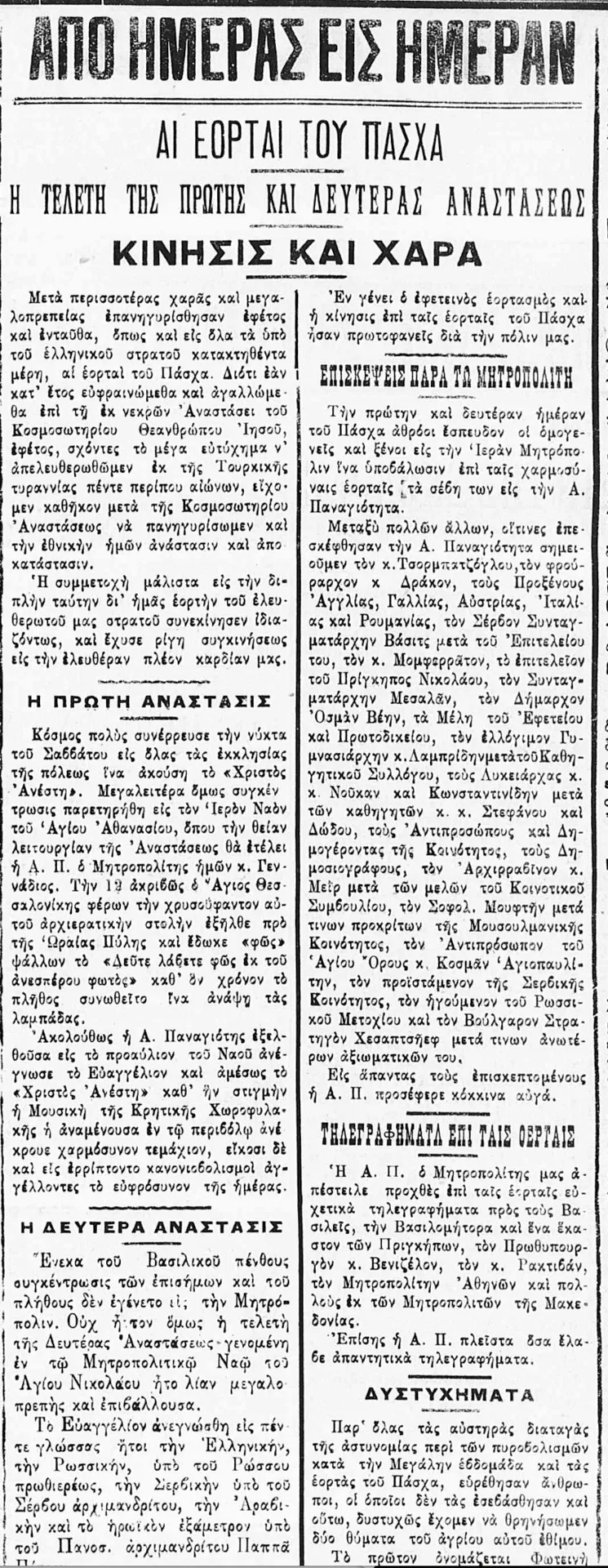 Έναν χρόνο αργότερα, όμως, το 1913, στην ίδια εφημερίδα, την επομένη της ακολουθίας της Αναστάσεως, στην απελευθερωμένη πια Θεσσαλονίκη, οι περιγραφές αλλάζουν εντελώς τόνο: οι εορτασμοί είναι τώρα λαμπροί, με τεράστια συμμετοχή κόσμου, παρουσία στρατιωτικών αγημάτων και μουσικής, με περιφορά επιταφίων στους δρόμους της πόλης.