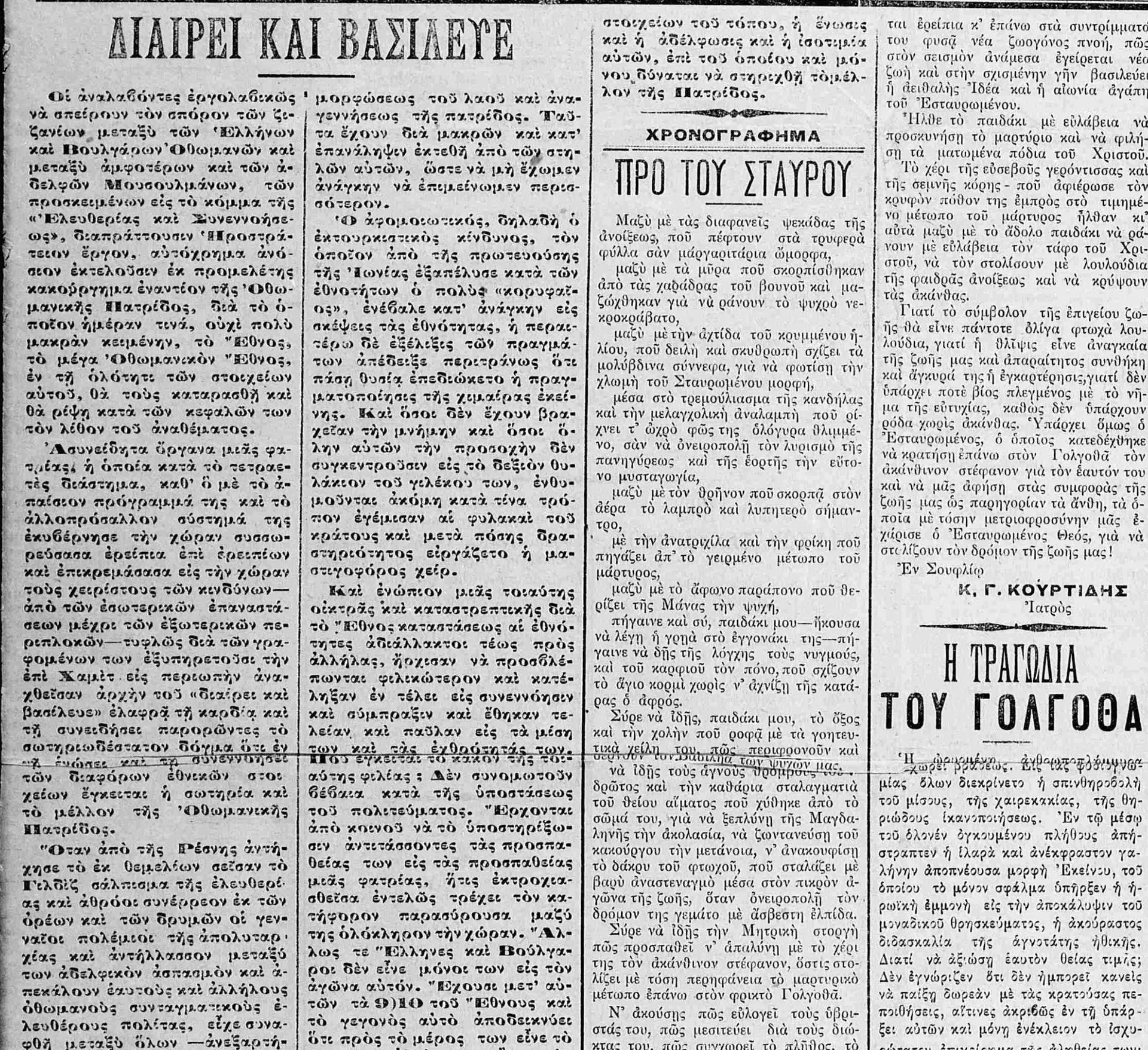 Είναι ενδεικτικό ότι στο φύλλο της εφημερίδας «Νέα Αλήθεια» που εκδόθηκε τη Μεγάλη Παρασκευή, οι δύο πρώτες στήλες του πρωτοσέλιδου φιλοξενούσαν κείμενο με τίτλο «Διαίρει και Βασίλευε», που κατήγγειλε τους διαπράττοντες «κακούργημα ἐναντίον τῆς Ὀθωμανικῆς Πατρίδος»:
