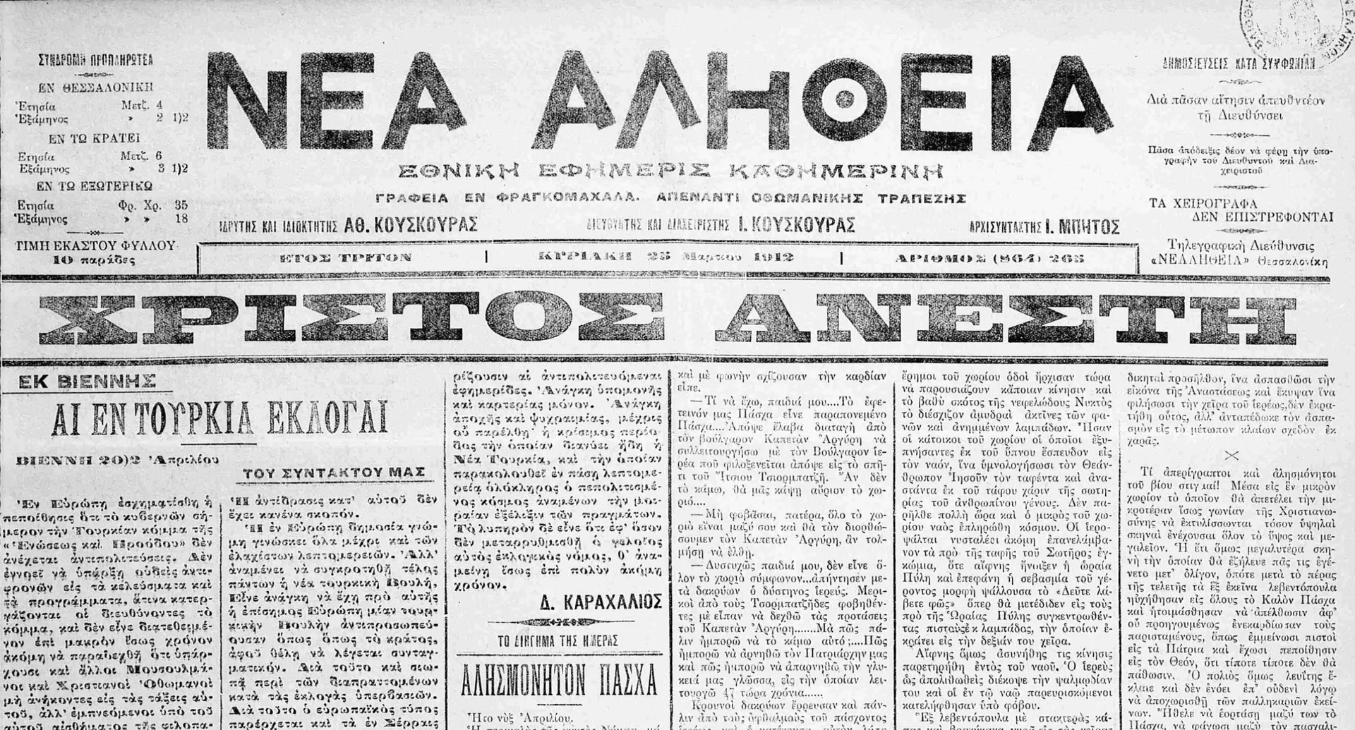 17 Μαρτίου 1912. Επτά περίπου μήνες πριν από την απελευθέρωση της Θεσσαλονίκης πλησιάζει το τελευταίο Πάσχα υπό τουρκική κατοχή. Στην εφημερίδα «Νέα Αλήθεια», πλάι στη διαφήμιση «Ἐπὶ τῇ εὐκαιρίᾳ τοῦ ΠΑΣΧΑ 20% ἔκπτωσις ἐπὶ τῶν ἐνδυμάτων διὰ παιδάκια παρὰ τῷ Τιριγγ», δημοσιεύεται ανακοίνωση της Νομαρχίας για τη ρητή απαγόρευση των πυροβολισμών «ἐπὶ ταῖς ἑορταῖς τοῦ Πάσχα». Στην επόμενη έκδοση της εφημερίδας, μετά την Ανάσταση, οι αναφορές στους εορτασμούς είναι περιορισμένες, όπως περιορισμένες ήταν και οι ίδιες οι εκδηλώσεις.