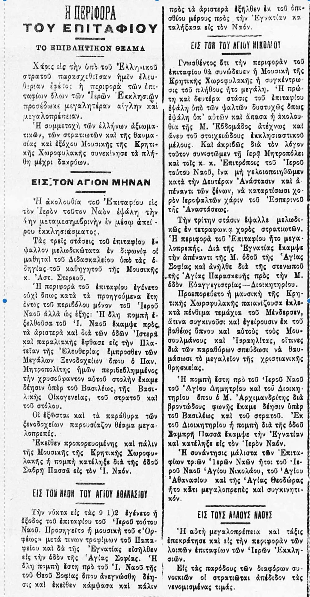 Χάρις εἰς τὴν ὑπὸ τοῦ Ἑλληνικοῦ στρατοῦ παρασχεθεῖσαν ἡμῖν ἐλευθερίαν ἐφέτος ἡ περιφορὰ τῶν ἐπιταφίων ὅλων τῶν Ἱερῶν Ἐκκλησιῶν προσέδωκε μεγαλυτέραν αἴγλην καὶ μεγαλοπρέπειαν. Ἡ συμμετοχὴ τῶν ἐλλήνων ἀξιωματικῶν, τῶν στρατιωτῶν καὶ τῆς θαυμασίας καὶ ἐξόχου Μουσικῆς τῆς Κρητικῆς Χωροφυλακῆς συνεκίνησε τὰ πλήθη μέχρι δακρύων.