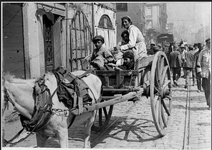 O Όουεν σκιαγραφεί «…τις πενθούσες οικογένειες, την κατάρρευση των σπιτιών καθώς οι φλόγες εξαπλώνονταν, παρασυρμένες από τον άνεμο· και στα στενά δρομάκια, μια αργοκίνητη μάζα από γαϊδουράκια, φορτωμένα καροτσάκια, αχθοφόροι που μετέφεραν τεράστια φορτία· Ελληνόπουλα πρόσκοποι (που έκαναν εξαιρετική δουλειά), στρατιώτες όλων των εθνών που δεν είχαν ακόμη οργανωθεί για να κάνουν κάτι συγκεκριμένο, παλιά ξύλινα πυροσβεστικά οχήματα που τρίζανε θλιβερά καθώς έριχναν άχρηστα σταγονίδια νερού, και άνθρωποι που μετέφεραν κρεβάτια, ντουλάπες, καθρέφτες, κατσαρόλες και τηγάνια, ραπτομηχανές (κάθε οικογένεια έκανε μια απελπισμένη προσπάθεια να σώσει τη ραπτομηχανή της) και μια γενική συλλογή από βαριά σκουπίδια».